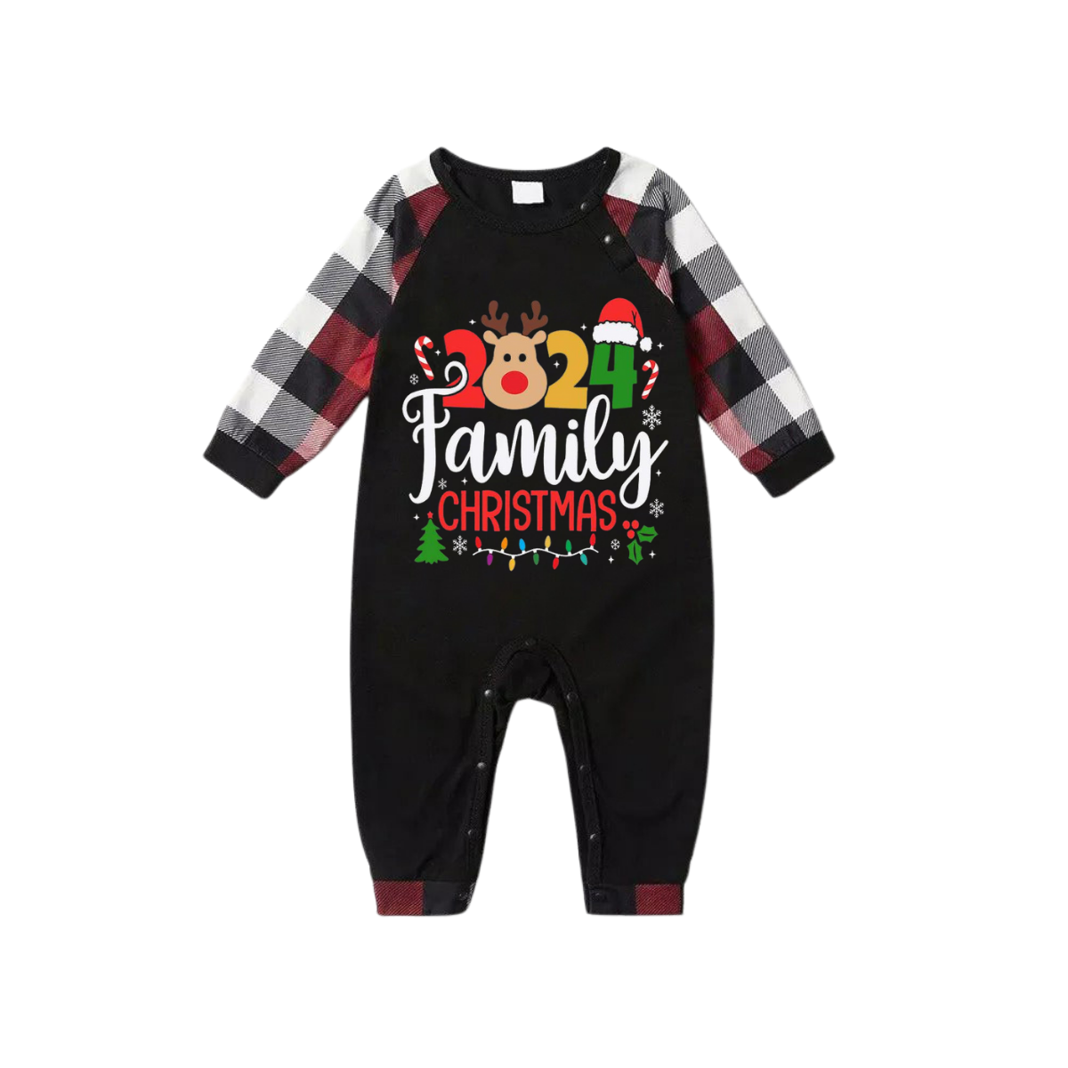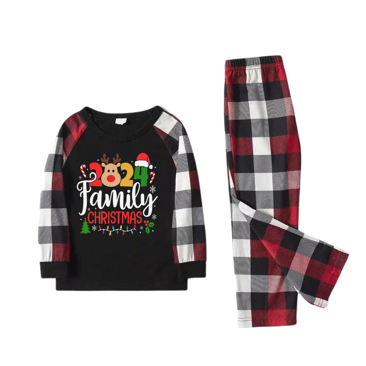 "2024 FAMILY CHRISTMAS " Colorful Text And Deer & Snowflake Printed Pattern - Black Top with Red&Black&White Plaid Sleeves - Family Matching Pajamas