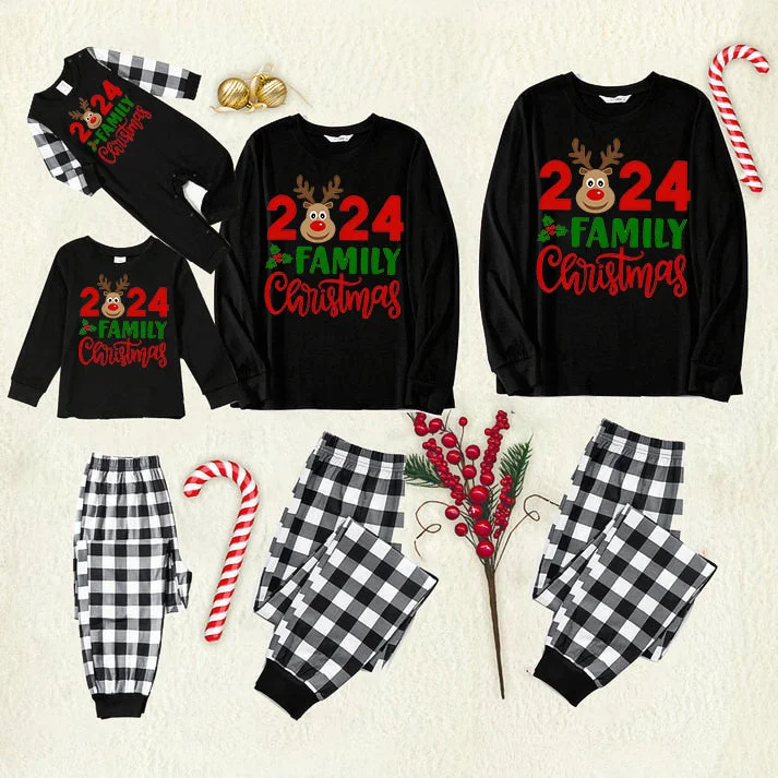 Get ready to cozy up in style with our ""2024 Family Christmas" Moose Letter Print Black Long Sleeve Top with Black And White Plaid Pants Family Matching Pajamas", perfect for the festive season. This adorable ensemble is designed for the whole family, including your beloved furry friend.