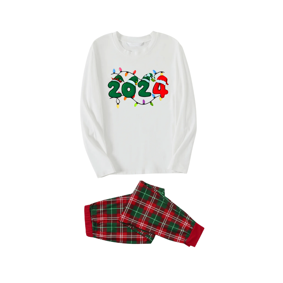 "2024" Text and Christmas Light Printed Red & Green Plaid Family Matching Pajamas