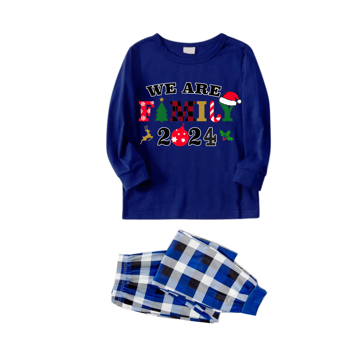 Celebrate the holidays in style with our family"2024"We Are Family" Colorful Monogram Prints Contrast Blue Long Sleeve with Versatile Blue and White Plaid Pants Family Matching Pajamas". Featuring a festive green cartoon character with a Santa hat pattern on a white top with contrast black long sleeves, this set is paired with cozy green and black plaid pants. Designed for comfort and warmth, these pajamas are made from soft, breathable fabric that's perfect for festive family gatherings, holiday photos, or cozy nights at home. Bring your family together and make the season extra special with these charming matching pajamas.