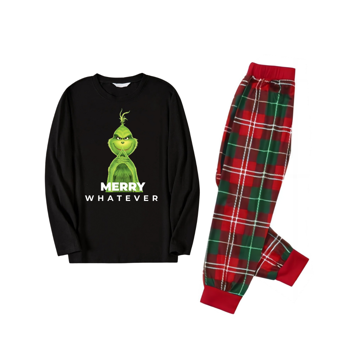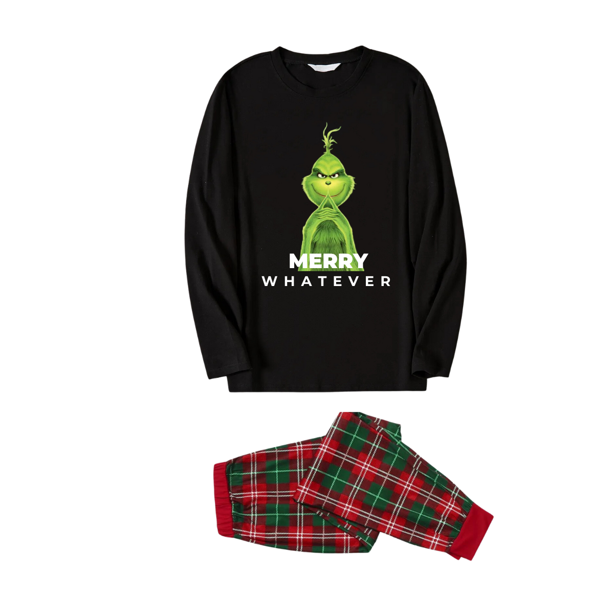 Cartoon Pattern and "Merry Whatever" Text Printed Red and Green Plaid Family Matching Pajamas