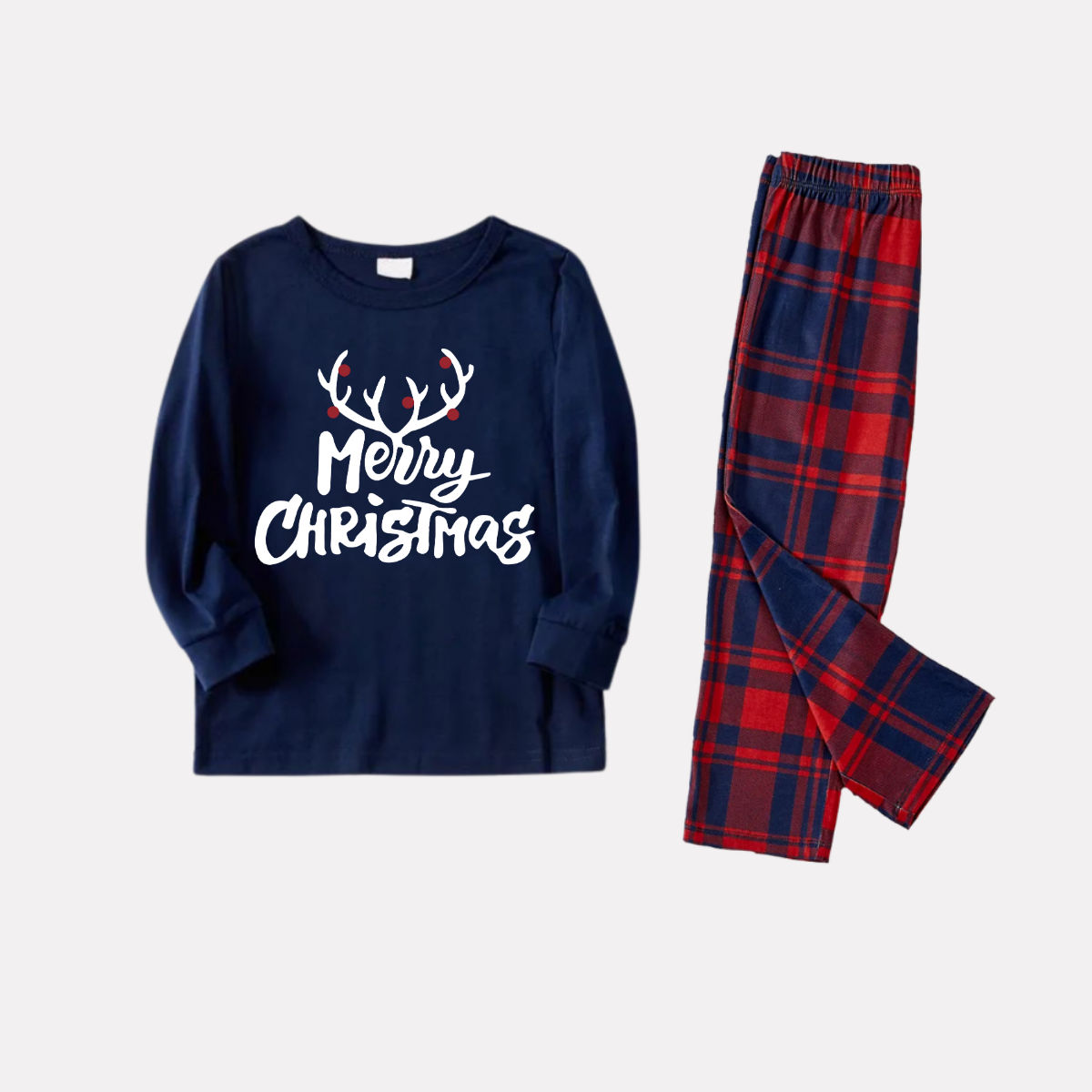 Get ready to cozy up in style with our "Christmas Antlers and Merry Christmas Print Blue Long Sleeve Top with Red & Blue Plaid Family Matching Pajamas", perfect for the festive season. This adorable ensemble is designed for the whole family, including your beloved furry friend.