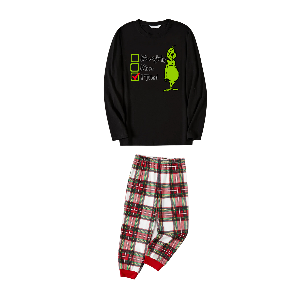 Get ready to cozy up in style with our "Christmas Cartoon and Text Print Black Long Sleeve Top with Red & White & Green Plaid Family Matching Pajamas", perfect for the festive season. This adorable ensemble is designed for the whole family, including your beloved furry friend.