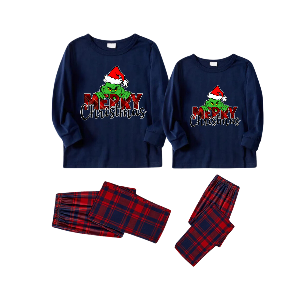 Christmas Catroon Pattern and Text Print Blue Long Sleeve Top with Red & Blue Plaid Christmas Couple Matching Pajama