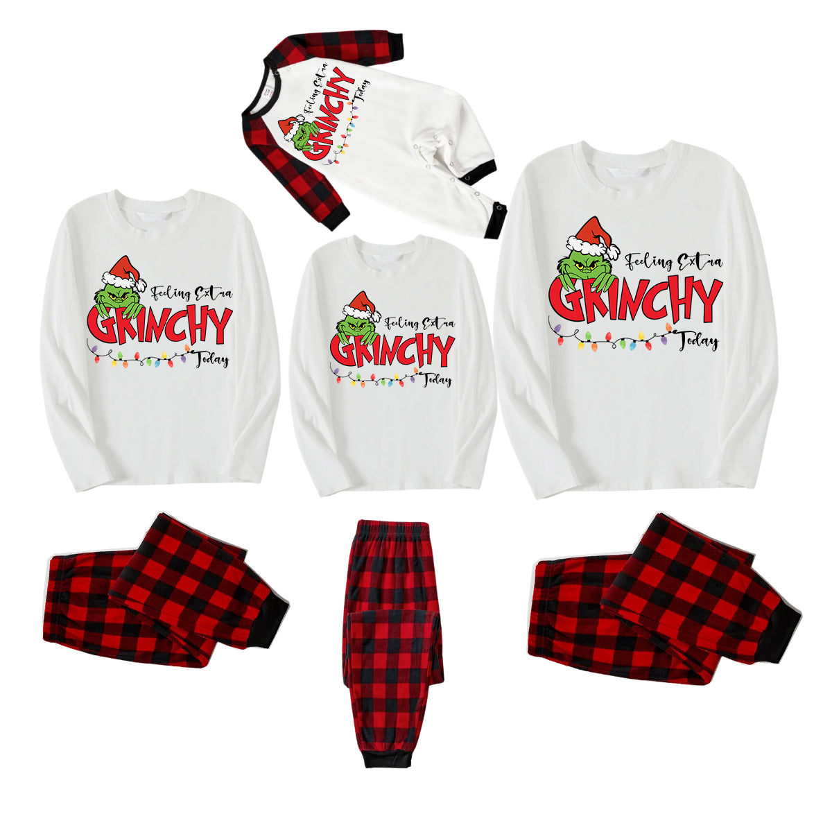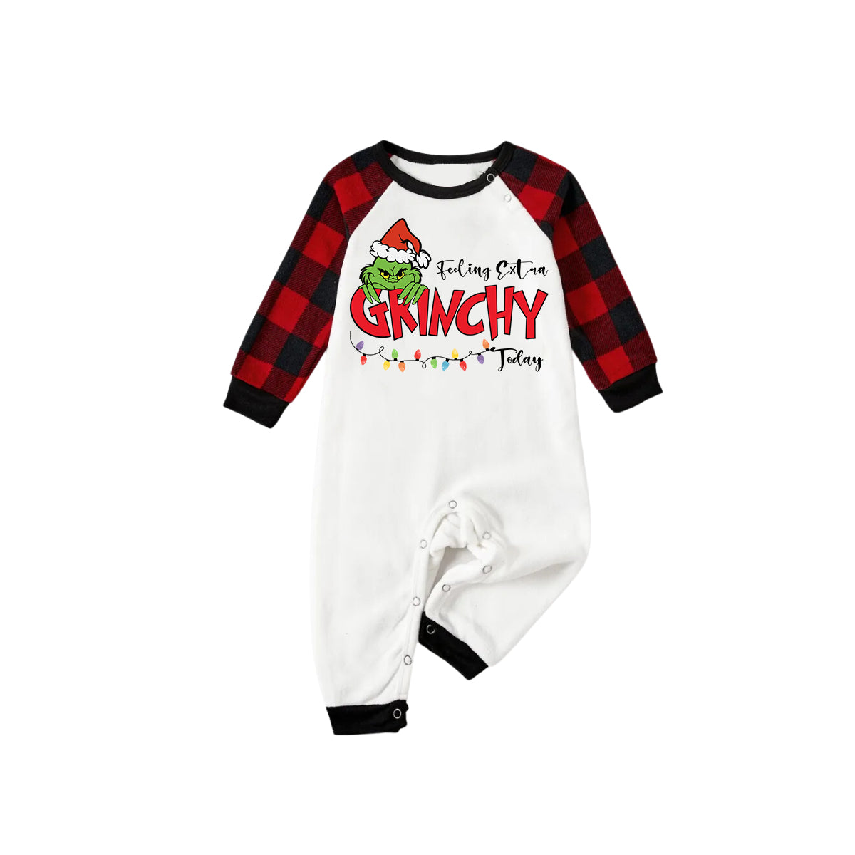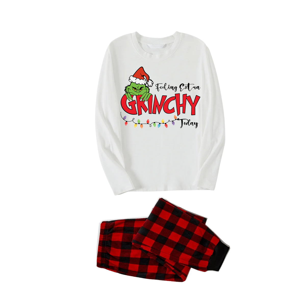 Embrace the festive spirit with our family matching pajamas set, featuring Christmas Green Cartoon Pettern And Red Letter Pattern Print White Top And Red & Black Plaid Pants Family Matching Pajamas. Made from soft and breathable fabric, these pajamas are perfect for creating cozy memories with your loved ones. Whether you're enjoying a holiday movie night, taking Christmas morning photos, or simply relaxing at home, this set offers comfort and style for the entire family. Celebrate the season together in these charming and coordinated pajamas that add a touch of holiday joy to your home.
