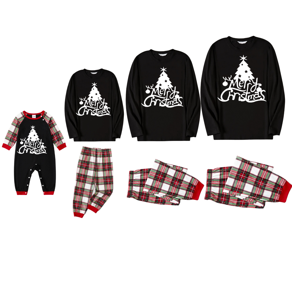 Get ready to cozy up in style with our "Christmas "Merry Christmas" Text and Tree Print Black Long Sleeve Top with Red & White & Green Plaid Family Matching Pajamas", perfect for the festive season. This adorable ensemble is designed for the whole family, including your beloved furry friend.