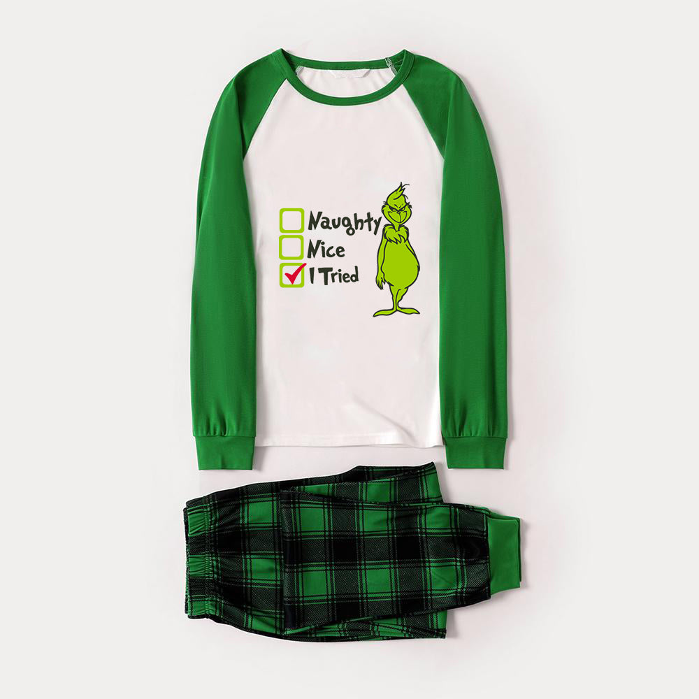 Christmas "Naughty&Nice& I Tried" Letter Print Patterned Casual Long Sleeve Sweatshirts Green Contrast Tops and Black and Green Plaid Pants Family Matching Raglan Long-sleeve Pajamas Sets With Pet Bandana