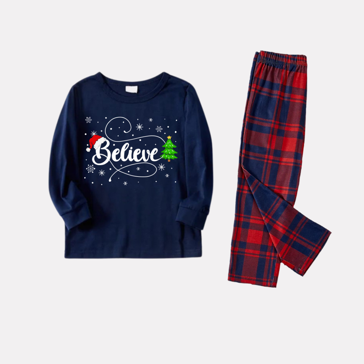 Get ready to cozy up in style with our "Christmas Tree and Believe Text Print Blue Long Sleeve Top with Red & Blue Plaid Family Matching Pajamas", perfect for the festive season. This adorable ensemble is designed for the whole family, including your beloved furry friend.
