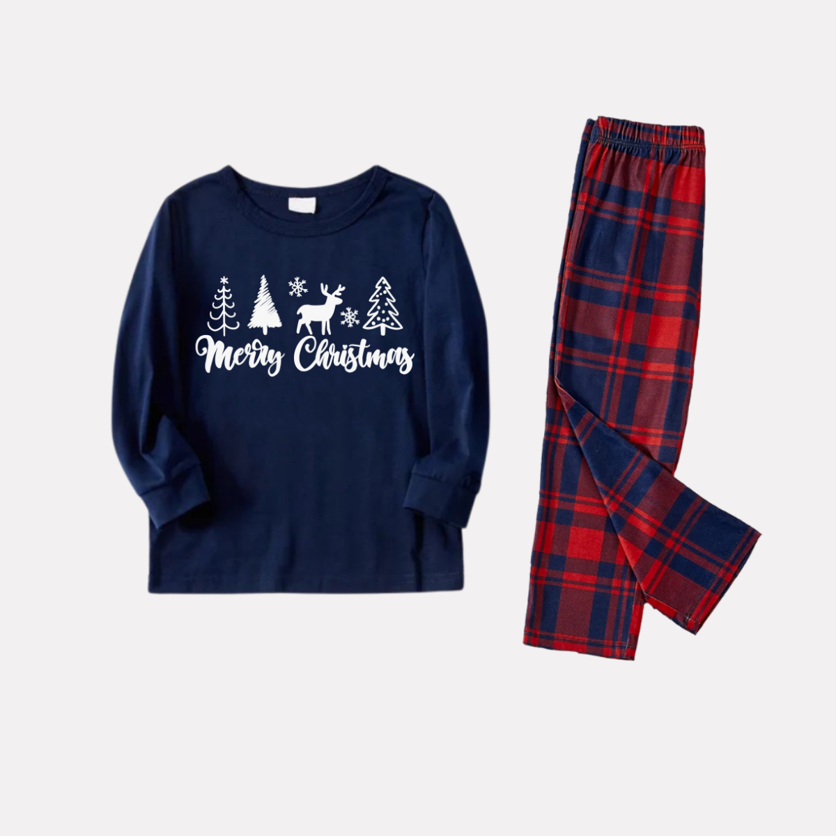 Get ready to cozy up in style with our "Christmas Tree and Elk and Text Print Blue Long Sleeve Top with Red & Blue Plaid Christmas Family Matching Pajamas", perfect for the festive season. This adorable ensemble is designed for the whole family, including your beloved furry friend.