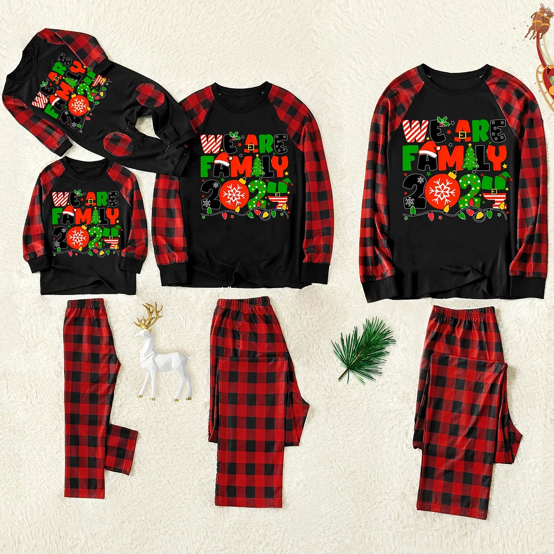 Get ready to cozy up in style with our "Christmas "We are Family" Colorful Multi-Element Letter Prints Black & Red Plaid Family Matching Black Pajamas", perfect for the festive season. This adorable ensemble is designed for the whole family, including your beloved furry friend.