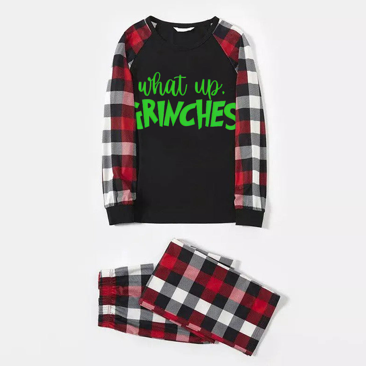 Christmas 'What Up' Letter Print Casual Plaid Sleeve Contrast Tops and Red & Black & White Plaid Pants Family Matching Pajamas Set With Dog Bandana