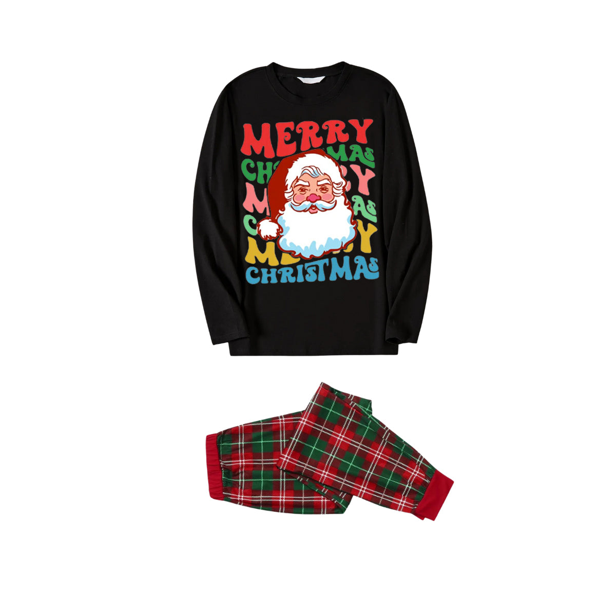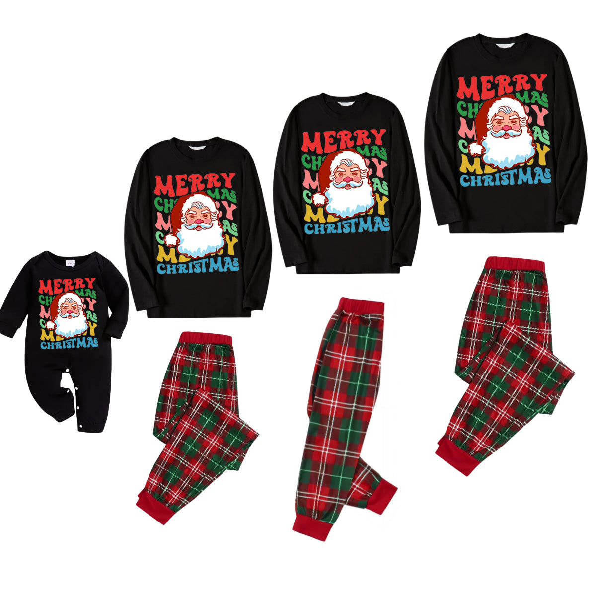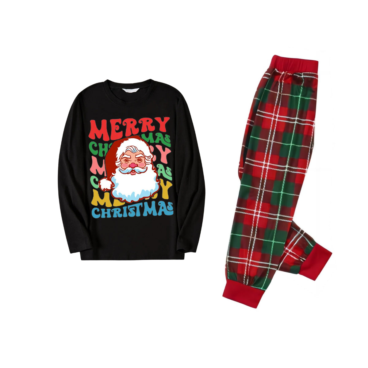 Colorful "Merry Christmas" and Santa Claus Print Black Top with Red & Green Plaid Pants Family Matching Pajama