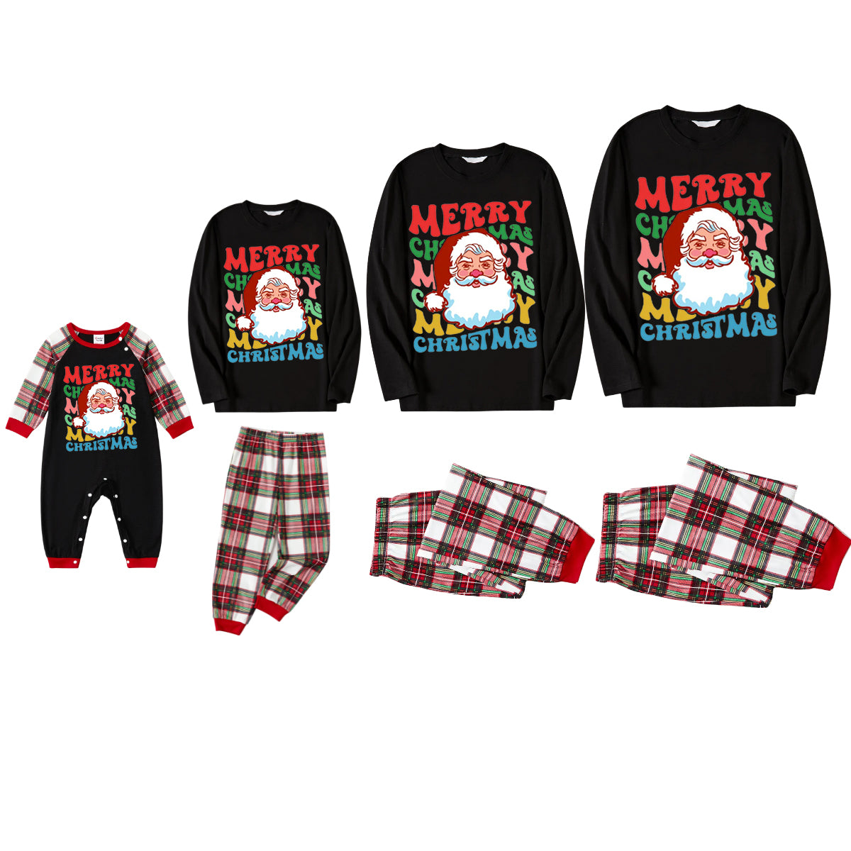 Colorful "Merry Christmas" and Santa Claus Print Black Top with Red & White & Green Plaid Pants Family Matching Pajamas