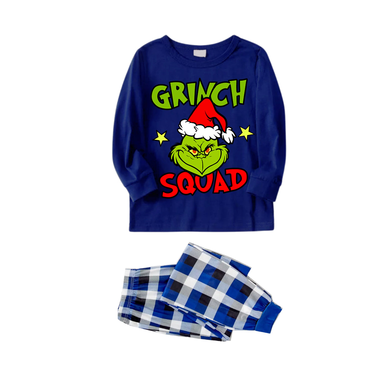 Cute Cartoon and Funny Christmas Slogan Print Contrast Blue Long Sleeve with Blue and White Plaid Pants Family Matching Pajamas