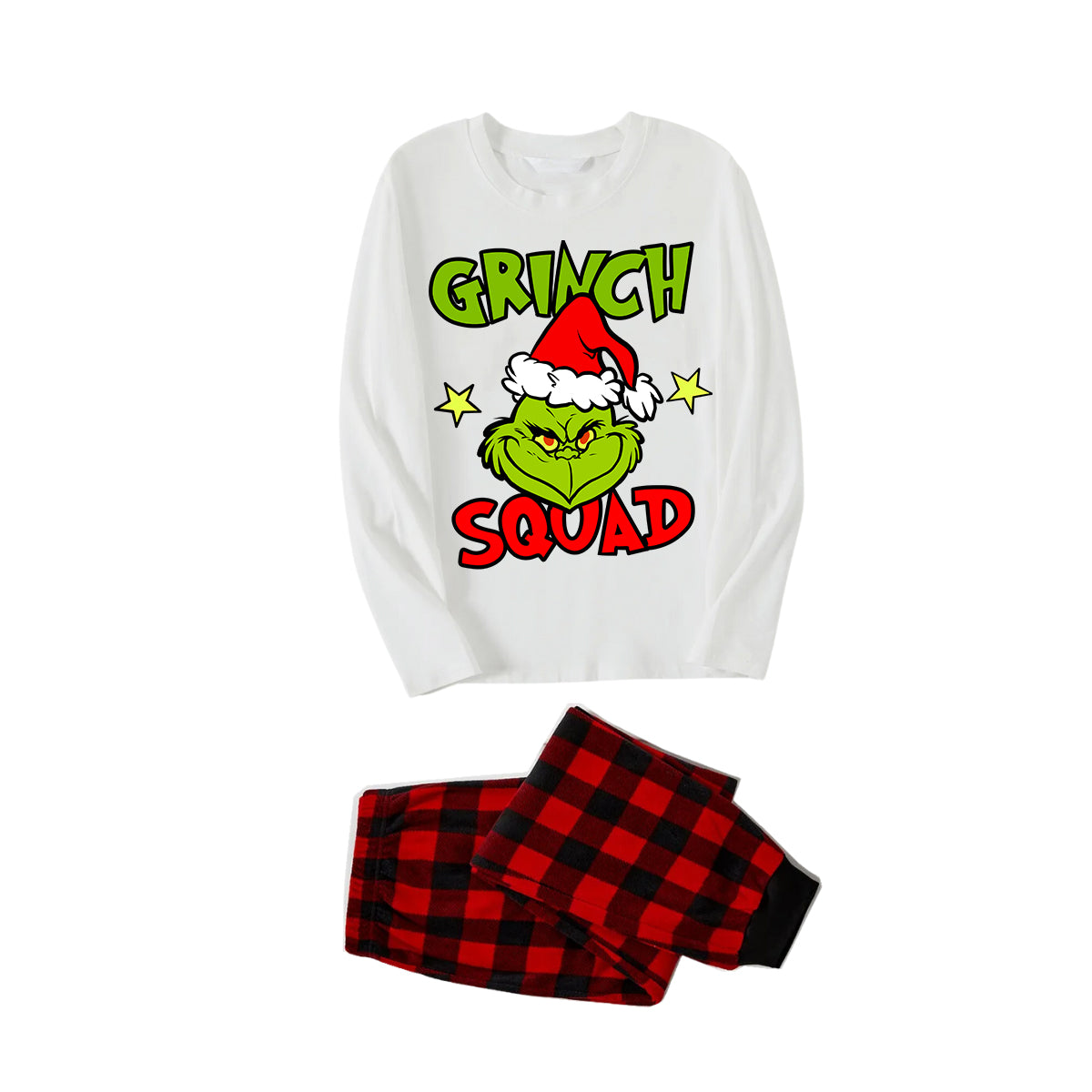 Cute Cartoon and Funny Christmas Slogan Print Contrast White Long Sleeve with Classic Red and Black Plaid Pants Family Matching Pajamas