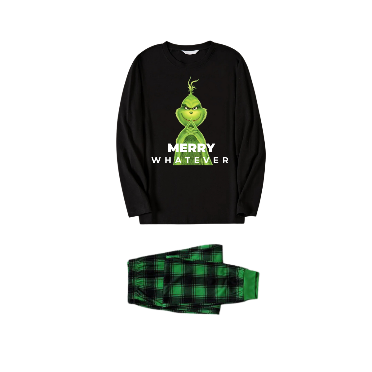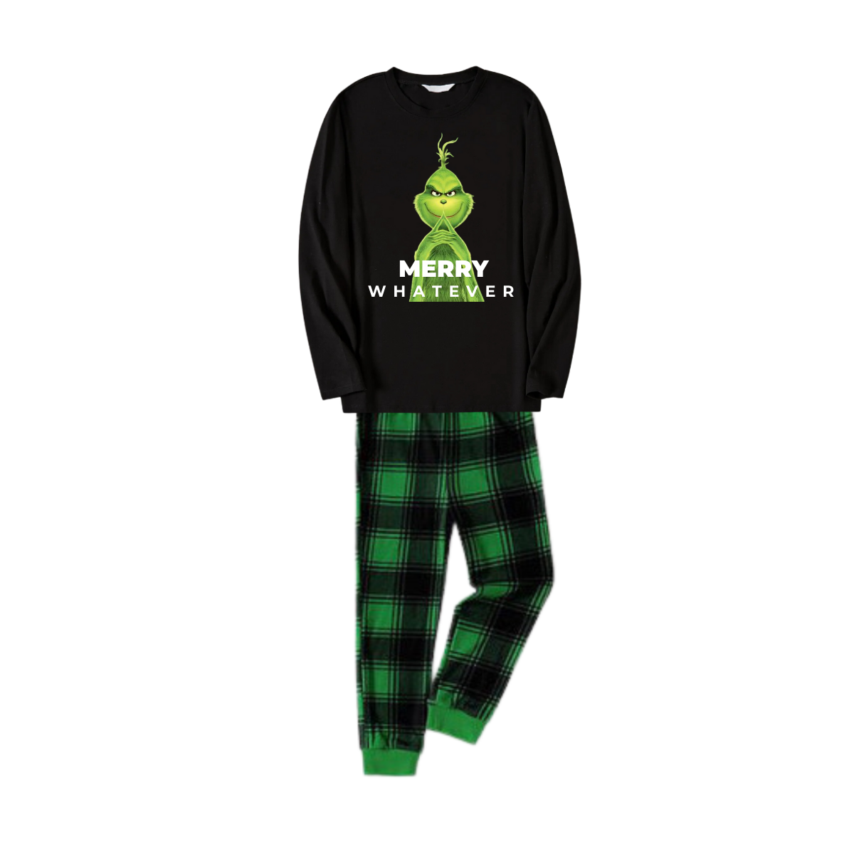 Cute Cartoon Pattern and "Merry Whatever" Slogan Printed Black Long Sleeve Top with Black And Green Plaid Pants Family Matching Pajamas