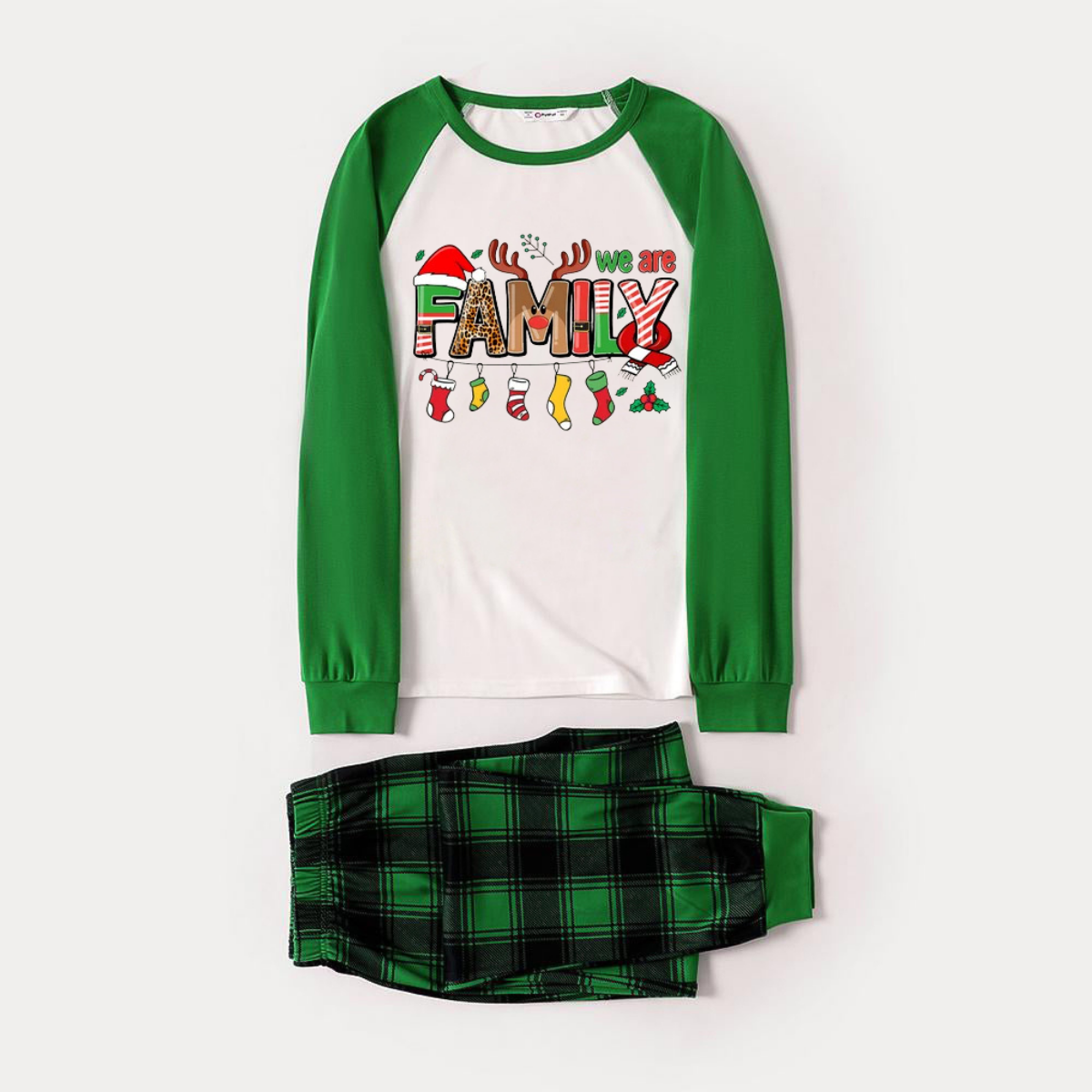Cute Family Text Print Long Sleeve Top With Green & Black Plaid Christmas Matching Pajamas