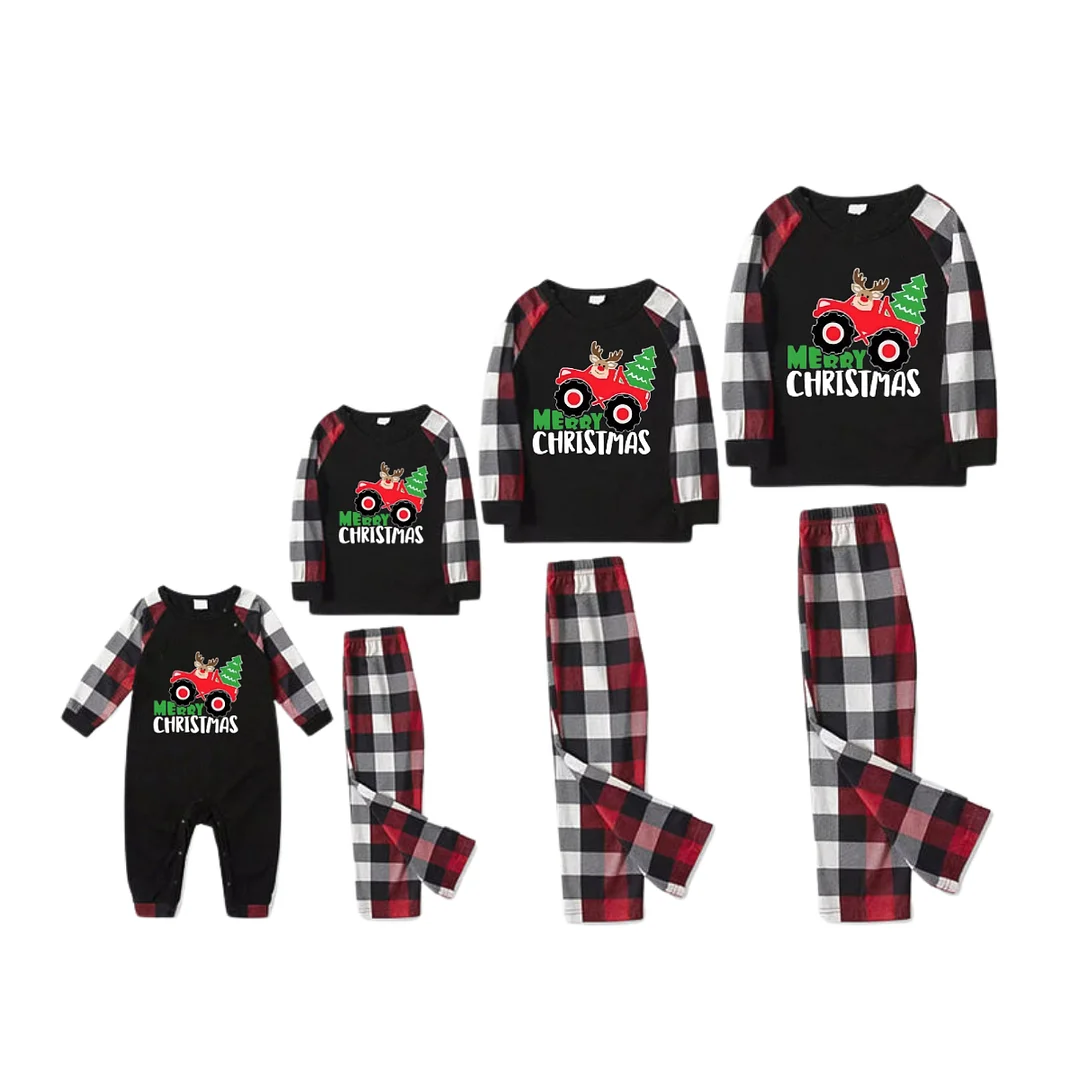 Driving Elk Cartoon Pattern Red&Black&White Plaid  Matching Pajamas