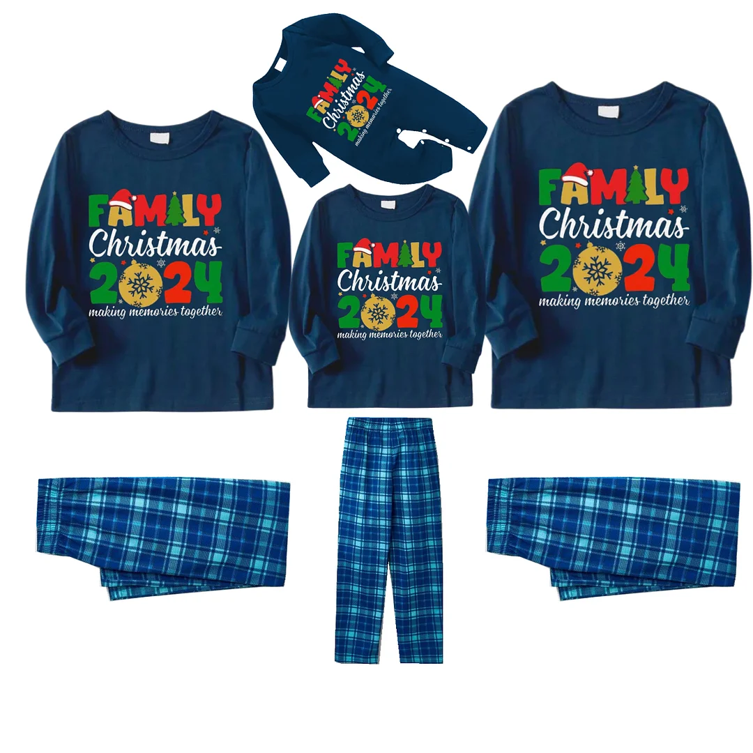 "Family Christmas 2024" Cute Text and Santa Hat Prints Blue Long Sleeve Top With Blue Plaid Family Matching Pajamas