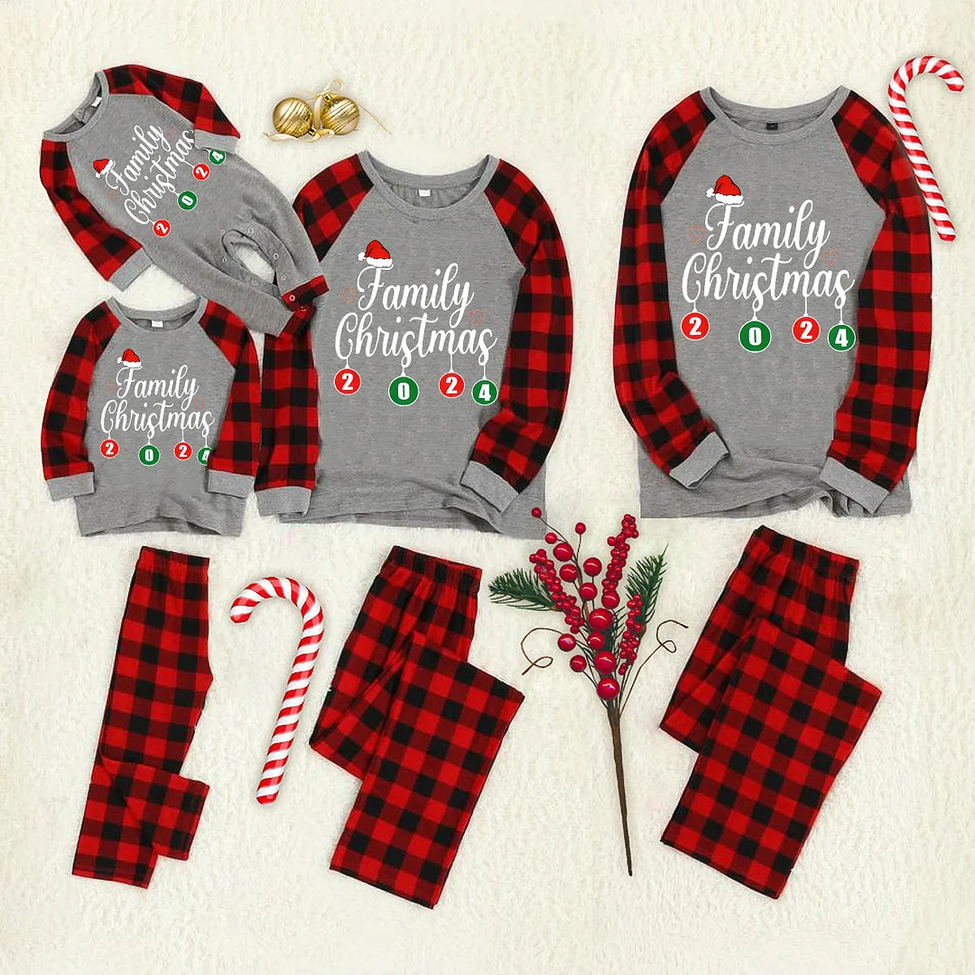 Get ready to cozy up in style with our ""Family Christmas" 2024 Letter Print Black & Red Plaid Family Matching Grey Pajamas With Dog bandana", perfect for the festive season. This adorable ensemble is designed for the whole family, including your beloved furry friend.