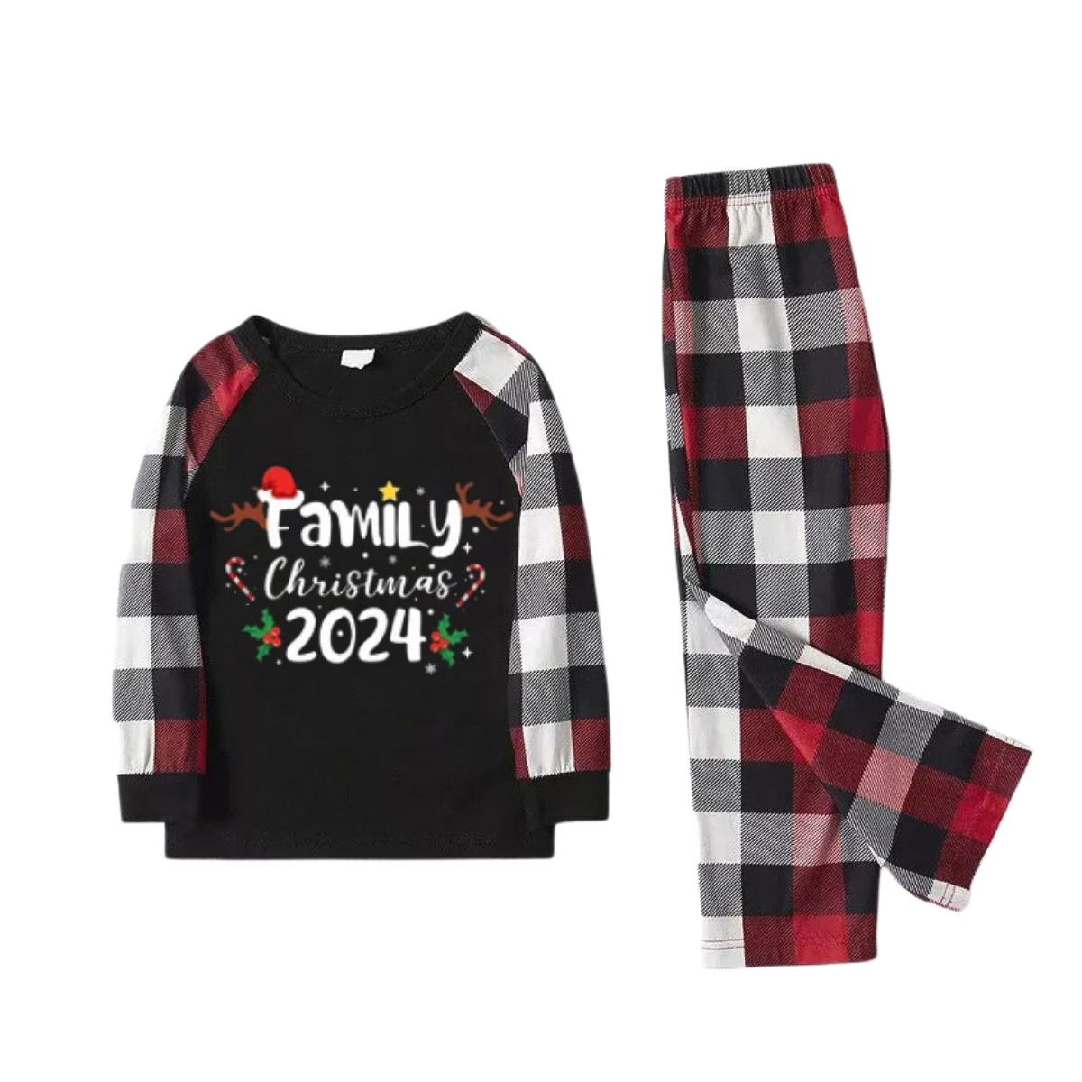 "FAMILY CHRISTMAS 2024" Text And Santa Hat & Snowflake Printed Pattern - Black Top with Red&Black&White Plaid Sleeves - Family Matching Pajamas