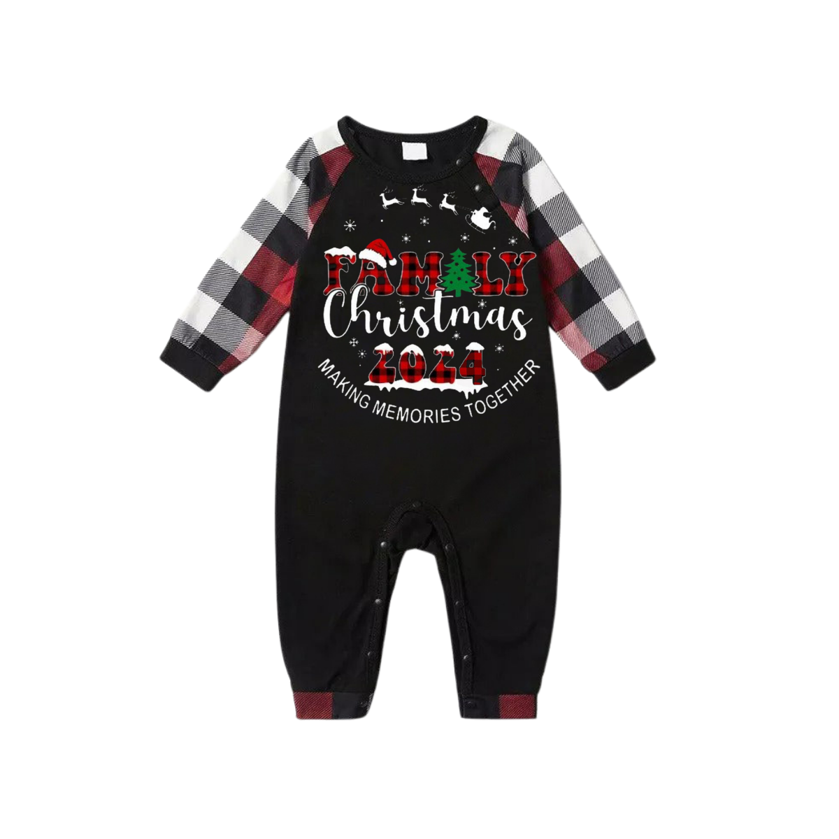"FAMILY CHRISTMAS 2024" Text Printed and Santa Hat Pattern- Black Top with Red&Black&White Plaid Sleeves - Family Matching Pajamas