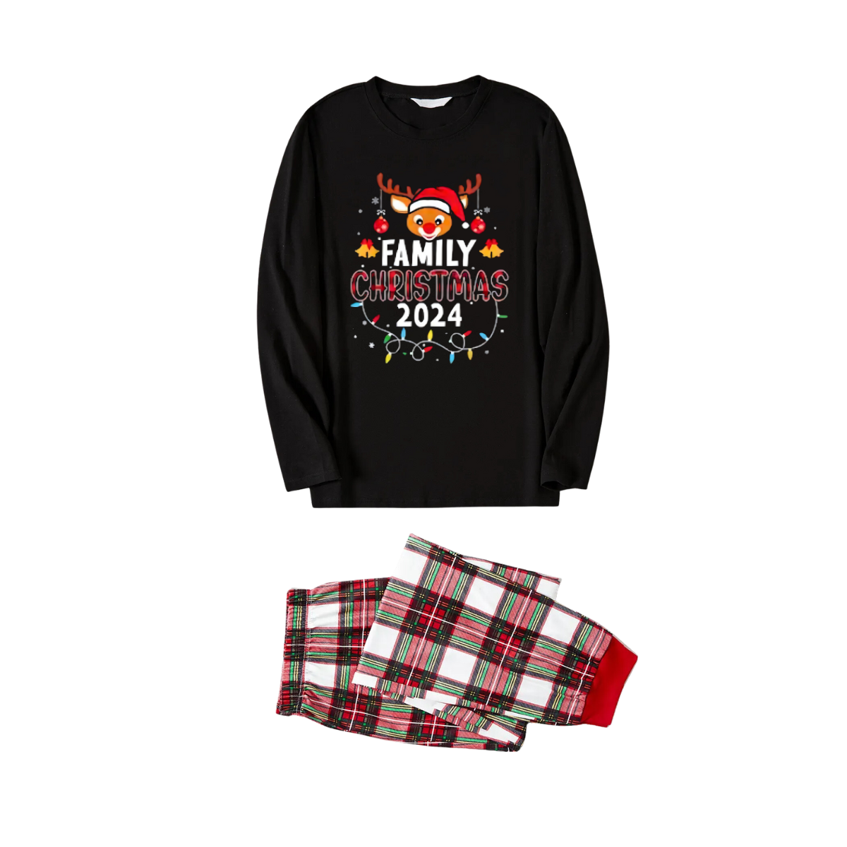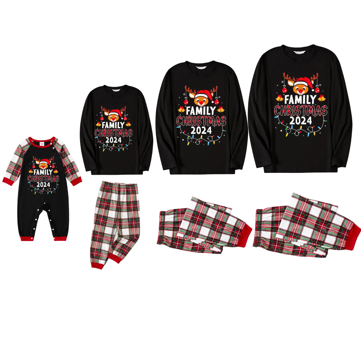 "Family Christmas 2024" with Elk Pattern- Black Top with Red & White & Green Plaid Pants Family Matching Pajamas