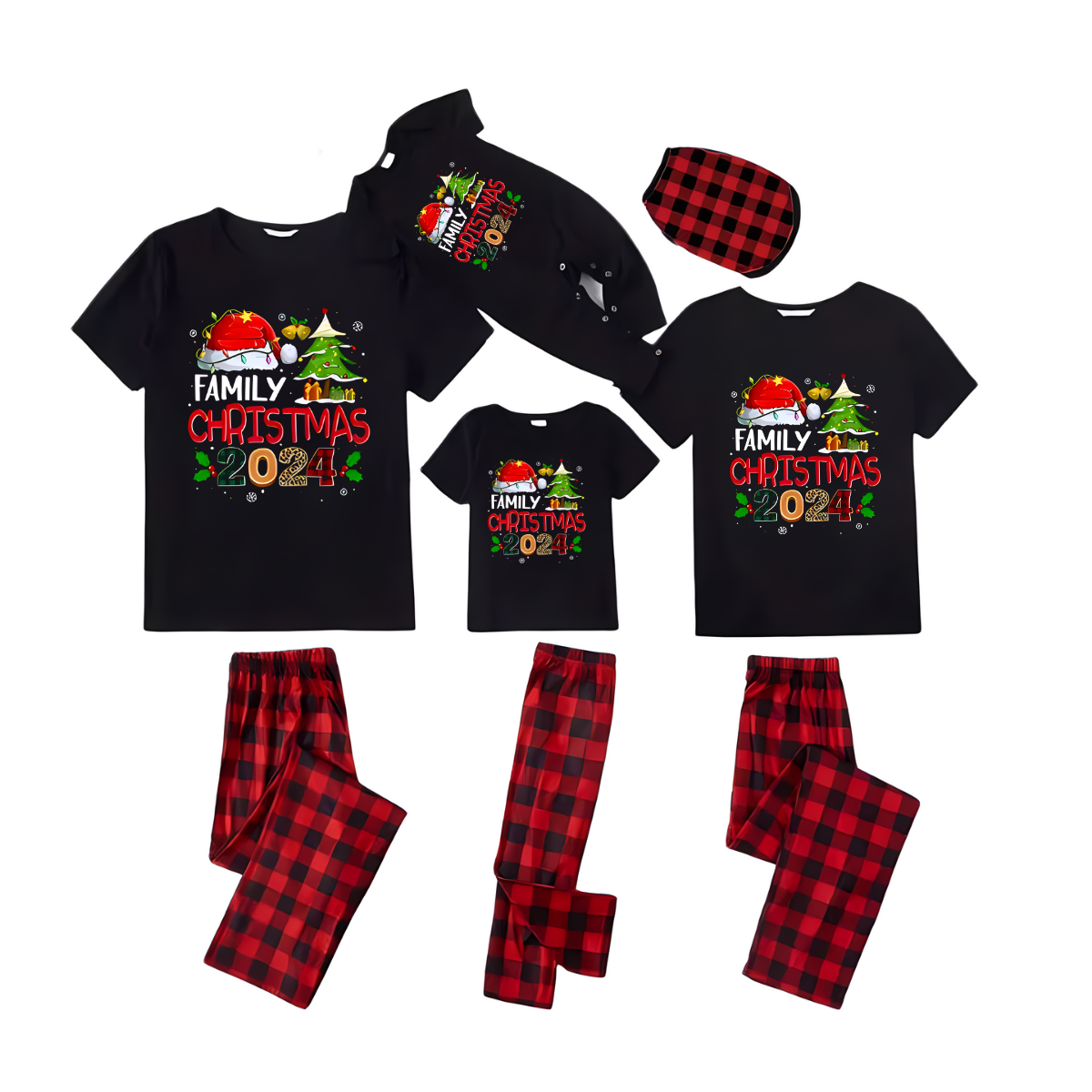 "Family Christmas 2024" with Santa Hat and Christmas Tree Pattern Black Short Sleeve with Red & Black Plaid Pant Family Matching Pajamas