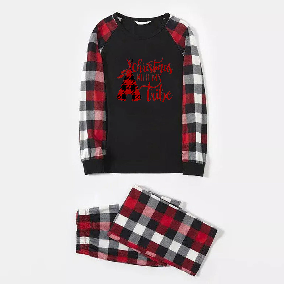 Family Christmas Shirts Christmas Tree Buffalo Plaid Patterned and 'Christmas WITH MY Tribe ' Letter Print Contrast Tops and Red & Black & White Plaid Pants Family Matching Pajamas Set With Dog Bandana