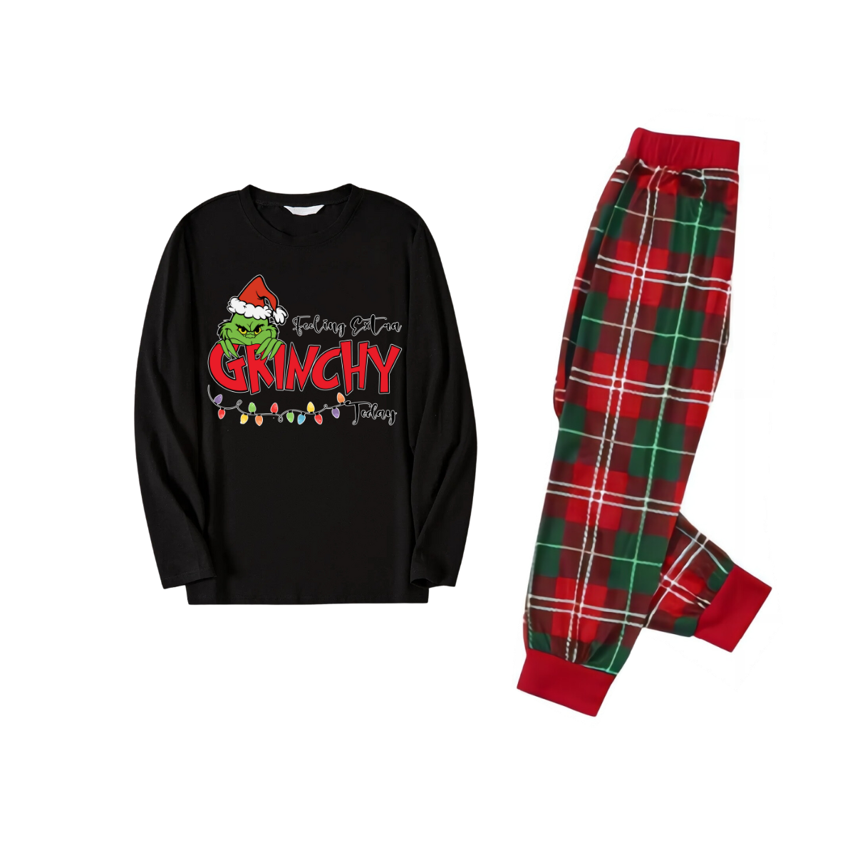 Green Cartoon Character and Text With Santa Hat Pattern Red and Green Plaid Family Matching Pajamas