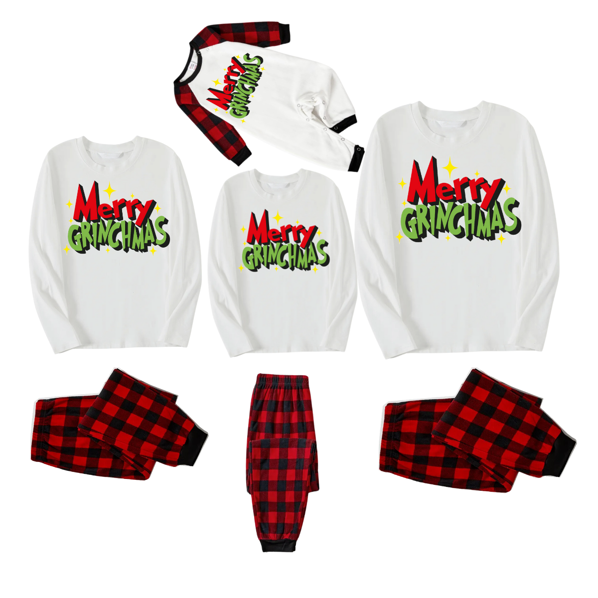 Celebrate the holidays with our "Merry Grinchmas" Letter Print White Long Sleeve Top with Red & Black Plaid Pants Family Matching Pajamas This set features a white long sleeve top with a festive "Merry Christmas" and tree design, paired with red and black plaid pants. Perfect for cozy family gatherings and holiday photos.