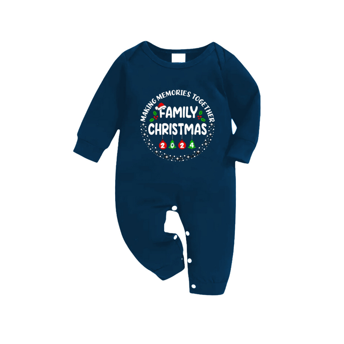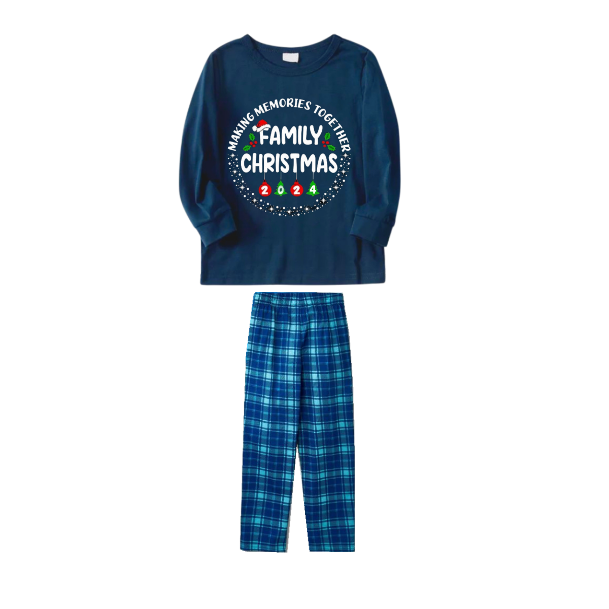 "MAKING MEMORIES TOGETHER FAMILY CHRISTMAS 2024" Text Pattern - Blue Long Sleeve Top With Blue Plaid Family Matching Pajamas
