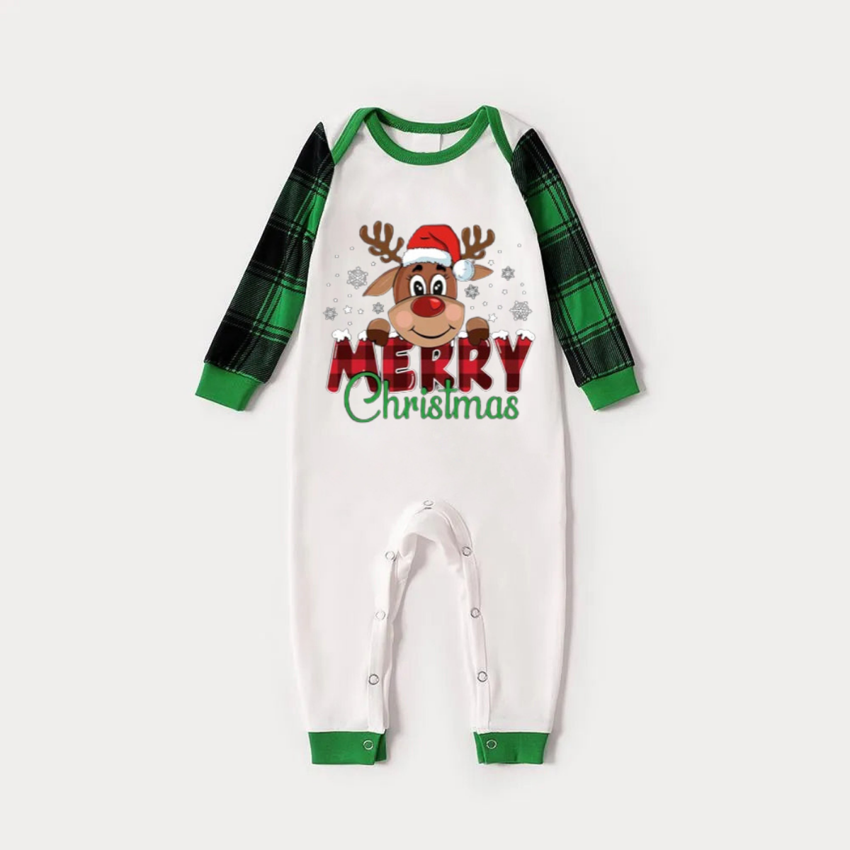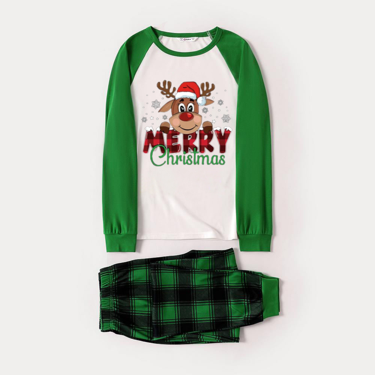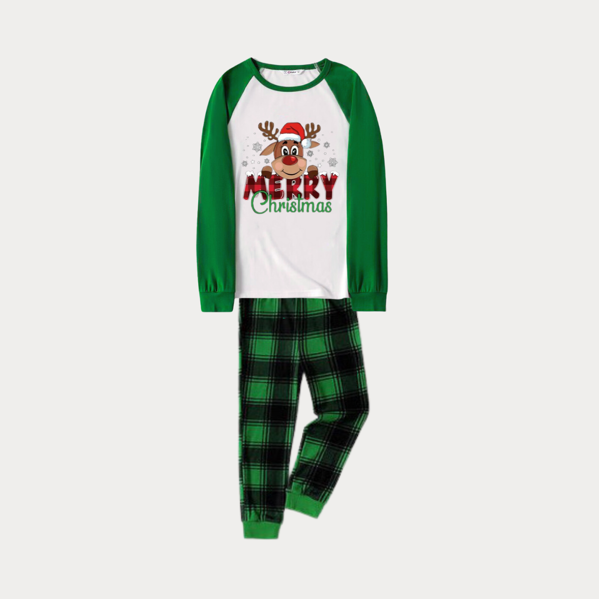 Merry Christmas and Deer Print Long Sleeve Top With Green & Black Plaid Christmas Family Matching Pajamas
