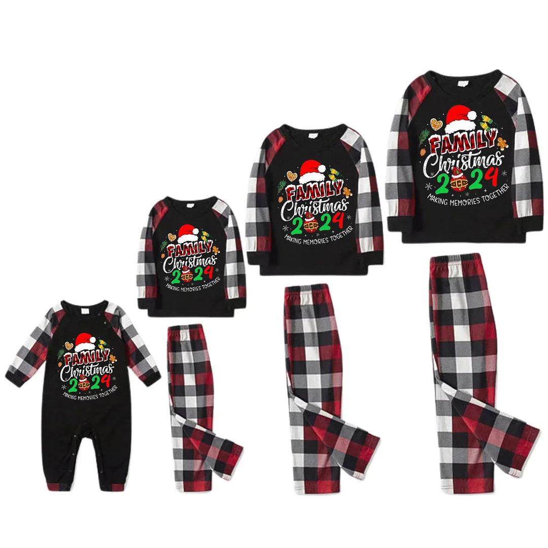 Santa Hat And "Family Christmas 2024 " Colorful Text Printed Pattern - Black Top with Red&Black&White Plaid Sleeves - Family Matching Pajamas