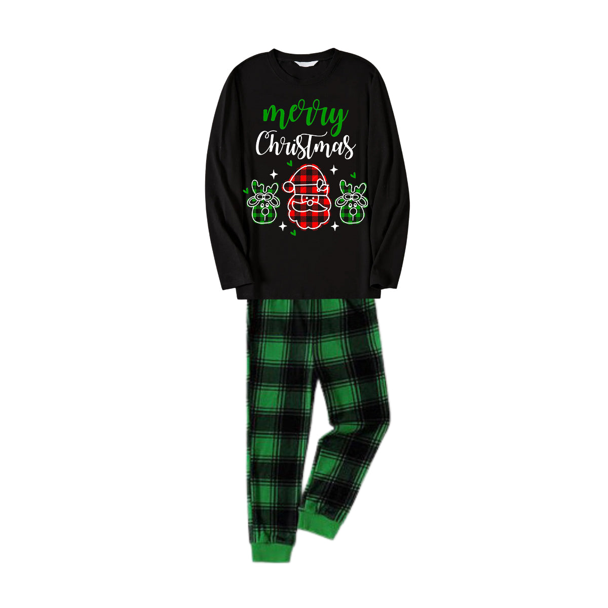 Get ready to cozy up in style with our "Santa Moose Cute Cartoon Pattern "Merry Christmas" Letter Prints Black Long Sleeves Top with Green and Black Classic Plaid Pants Family Matching Pajamas", perfect for the festive season. This adorable ensemble is designed for the whole family, including your beloved furry friend.