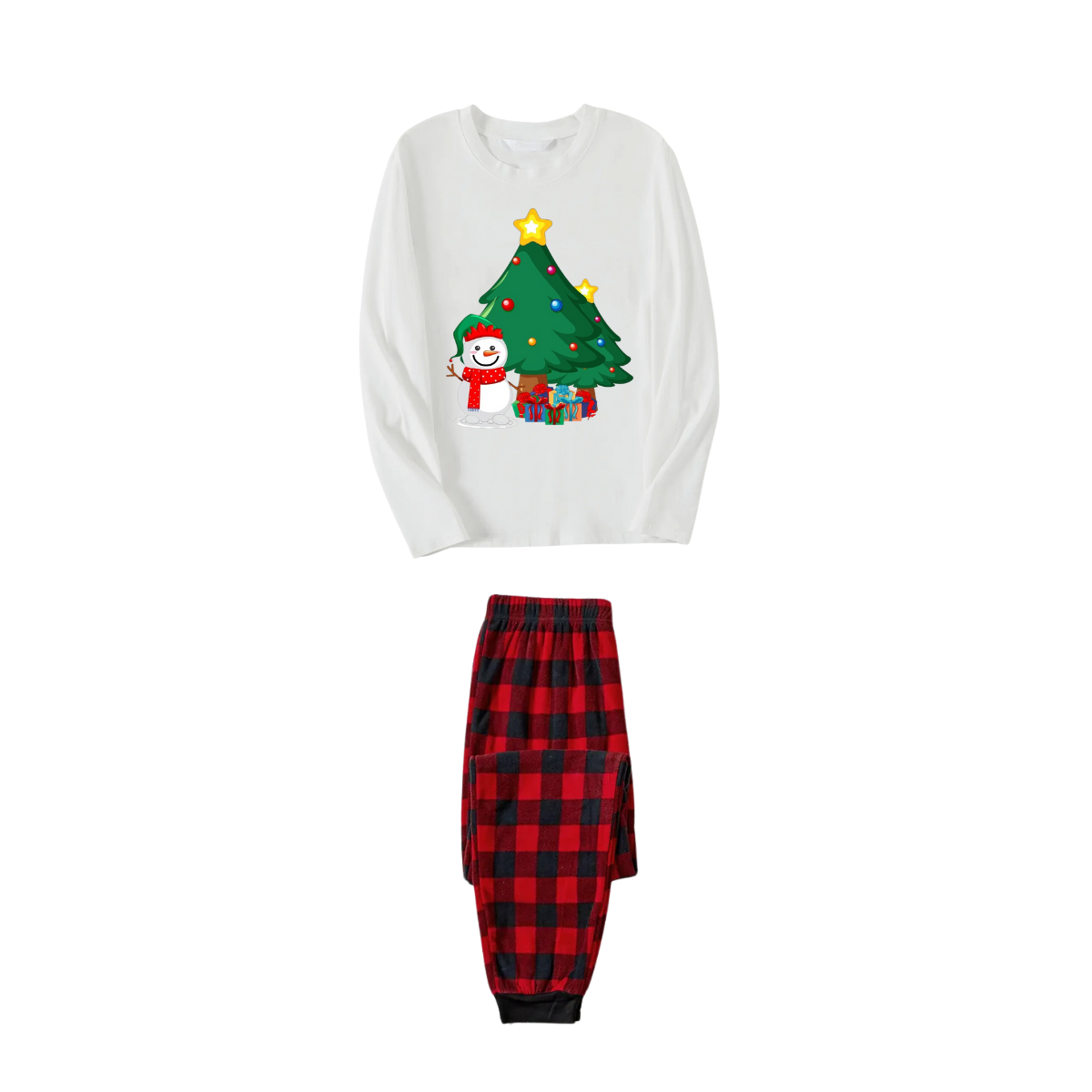 Celebrate the holidays with our Family Matching Pajamas! Featuring a white long sleeve top adorned with a Christmas tree and smiling snowman with gift pattern, paired with cozy red and black plaid pants. This set is perfect for festive family gatherings and holiday photos.
