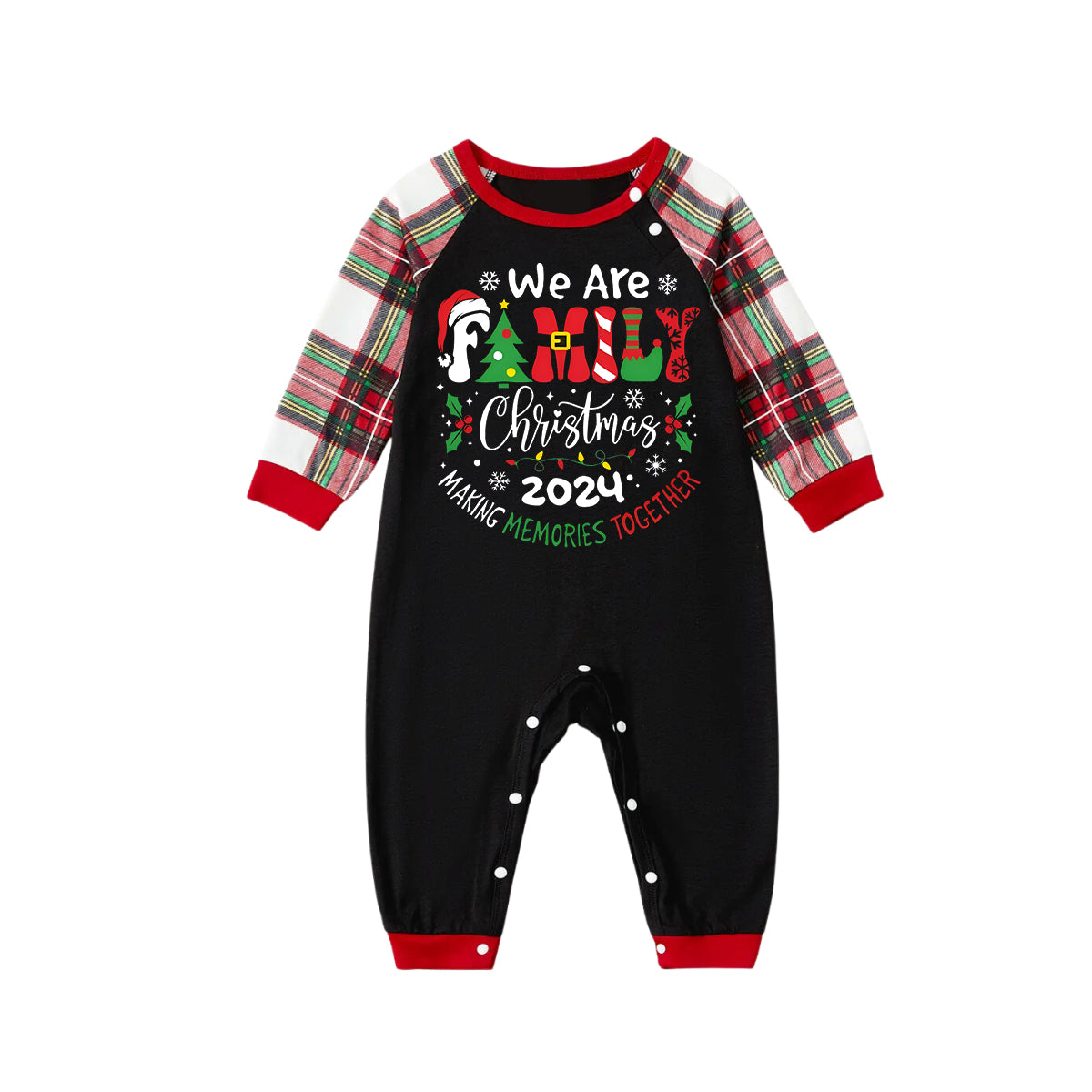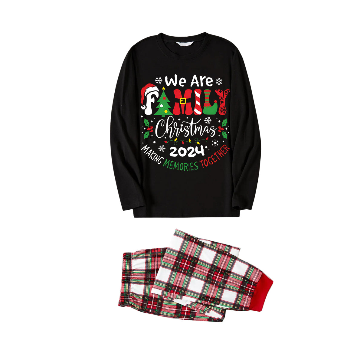 Get ready to cozy up in style with our ""We are Family" 2024 Christmas Wreath - Black Top with Red & White & Green Plaid Pants Family Matching Pajamas", perfect for the festive season. This adorable ensemble is designed for the whole family, including your beloved furry friend.